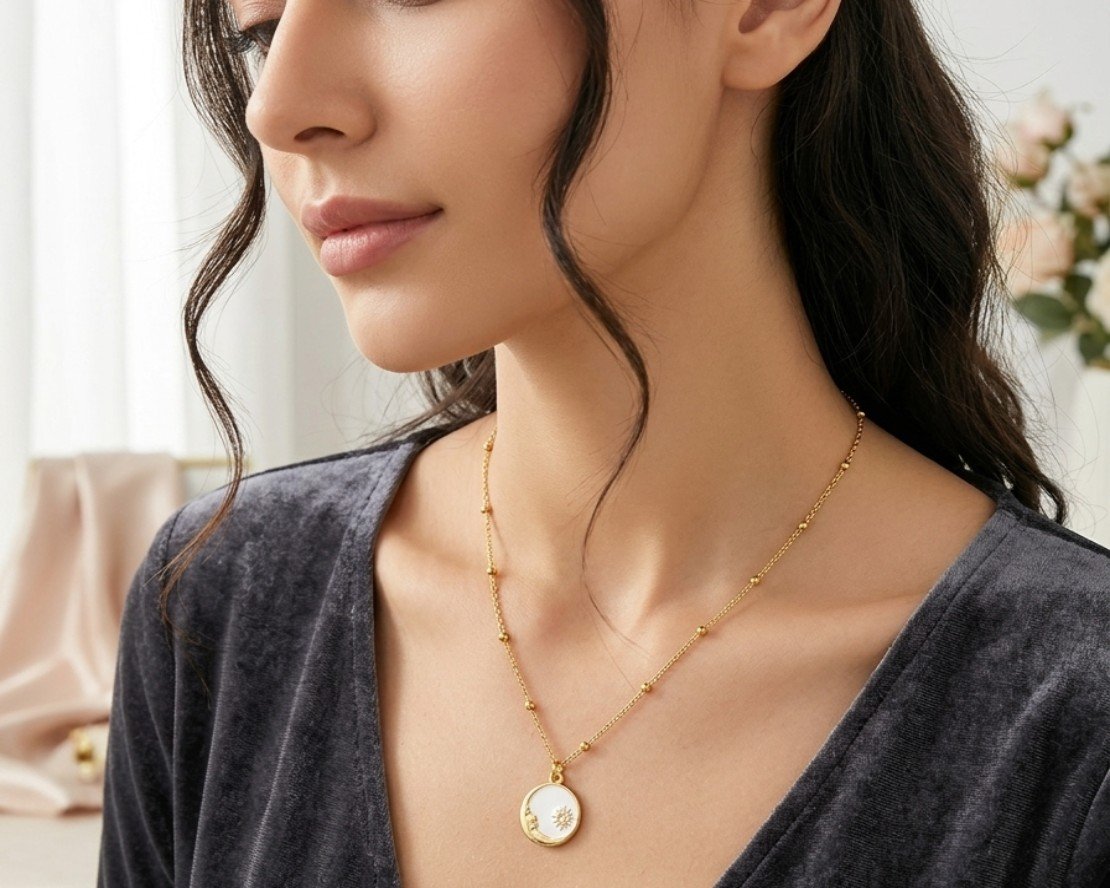 Delicate gold tone necklace with a small round pendant and fine bead details. Simple, elegant, and perfect for everyday wear.