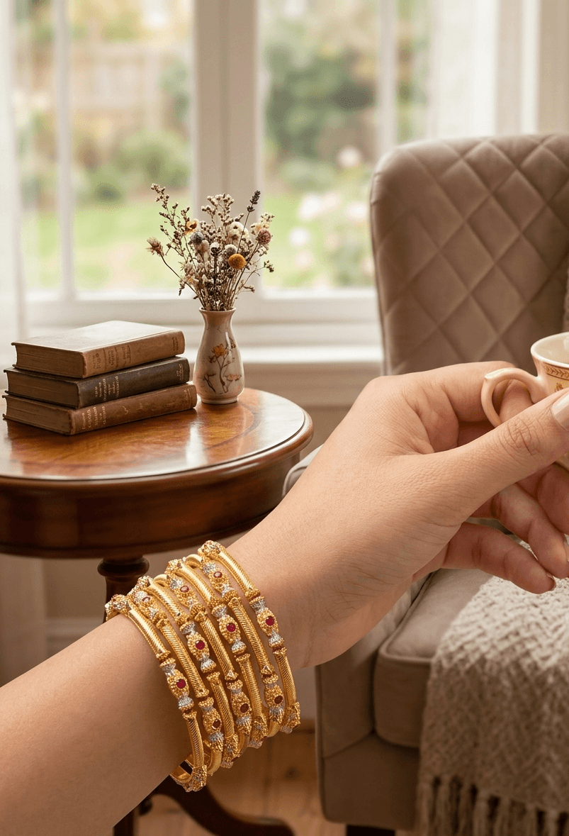 A beautifully crafted bracelet set featuring intricate gold detailing with subtle red stone accents for a rich, traditional look.