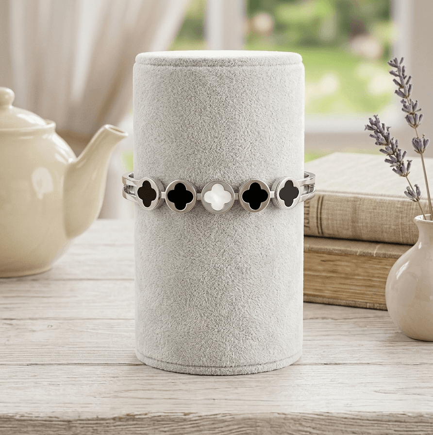 A stylish bracelet featuring clover inspired accents in contrasting tones, set on a sleek polished band for a modern look.