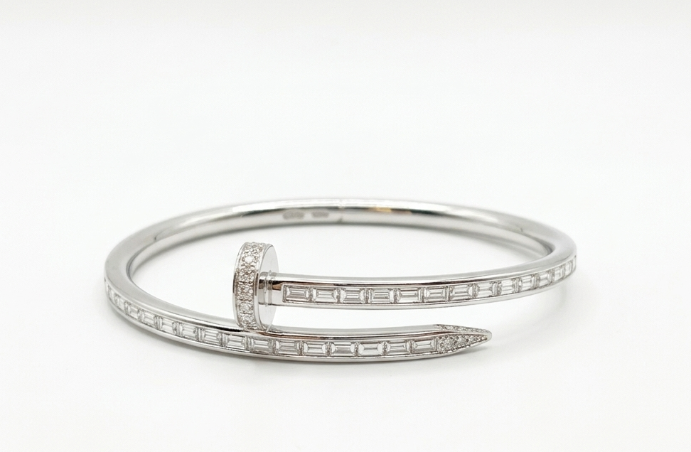 Elegant silver nail style bracelet adorned with sparkling stones, designed for a sleek and luxurious finish.